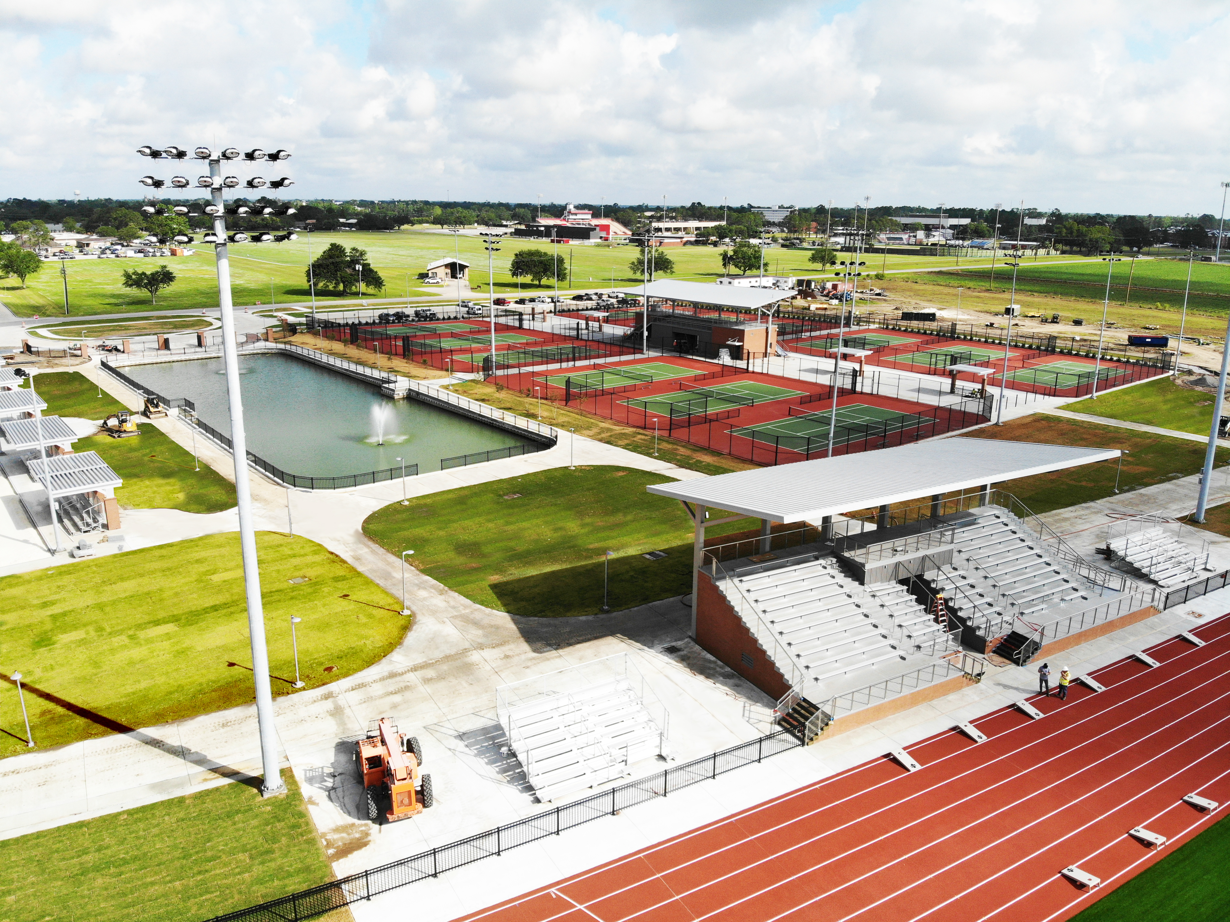 This expansion of the original 252,000 SF Wellness Center will feature 12 tennis courts, 12 sand volleyball courts, a multi-purpose field, an 8-lane track (all built to NCAA standards), as well as a pavilion, restrooms, concession area, and a spray park.