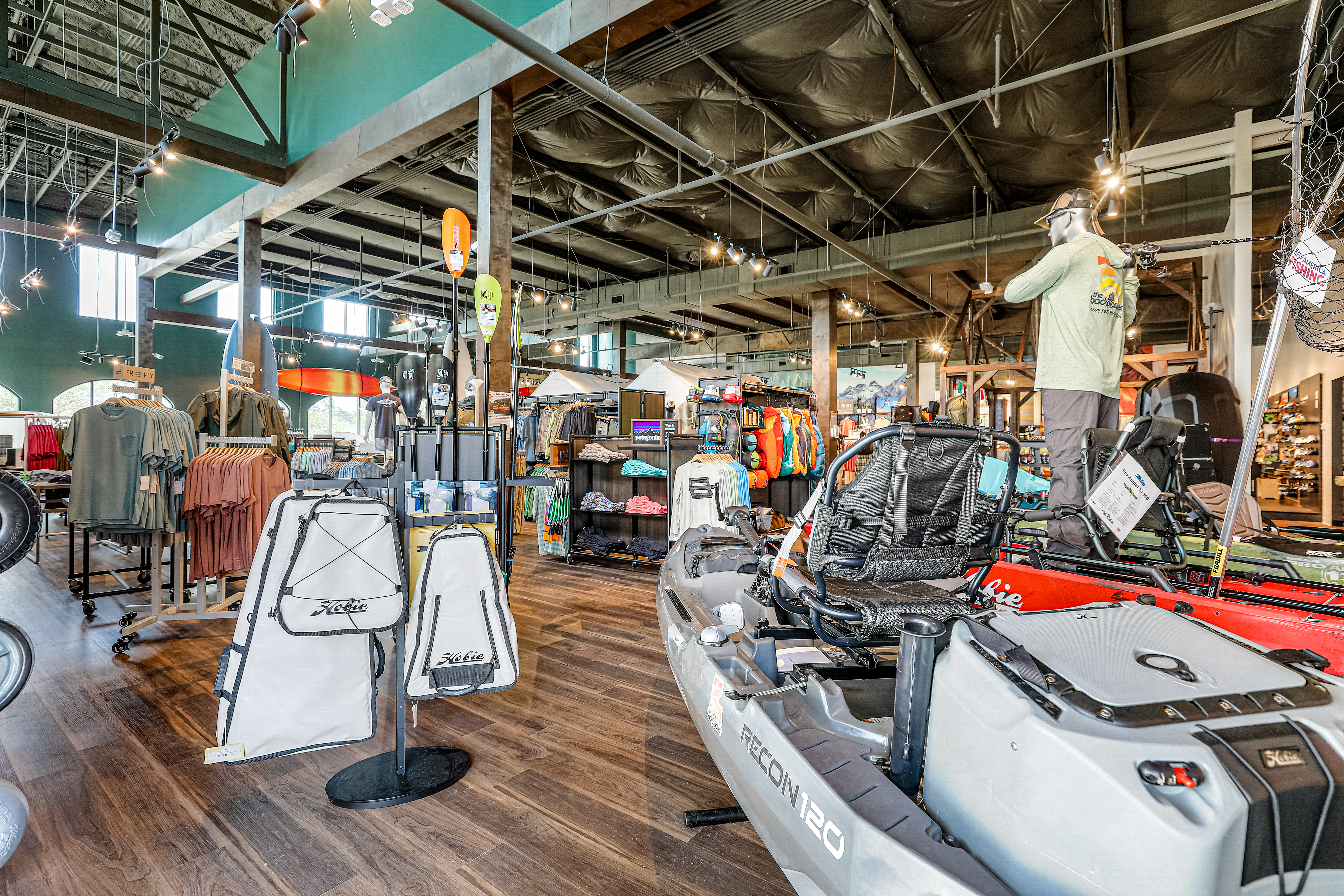 Our team recently completed The Backpacker, a new 7,000 SF retail store focusing on outdoor gear and apparel. The store makes use of an outdoor and nature-inspired material palette and an open layout to create a unique customer experience. Dressing rooms mimic tent structures with canvas walls, and a custom-built light fixture is made from a recycled canoe. The store features a working wood fire place.