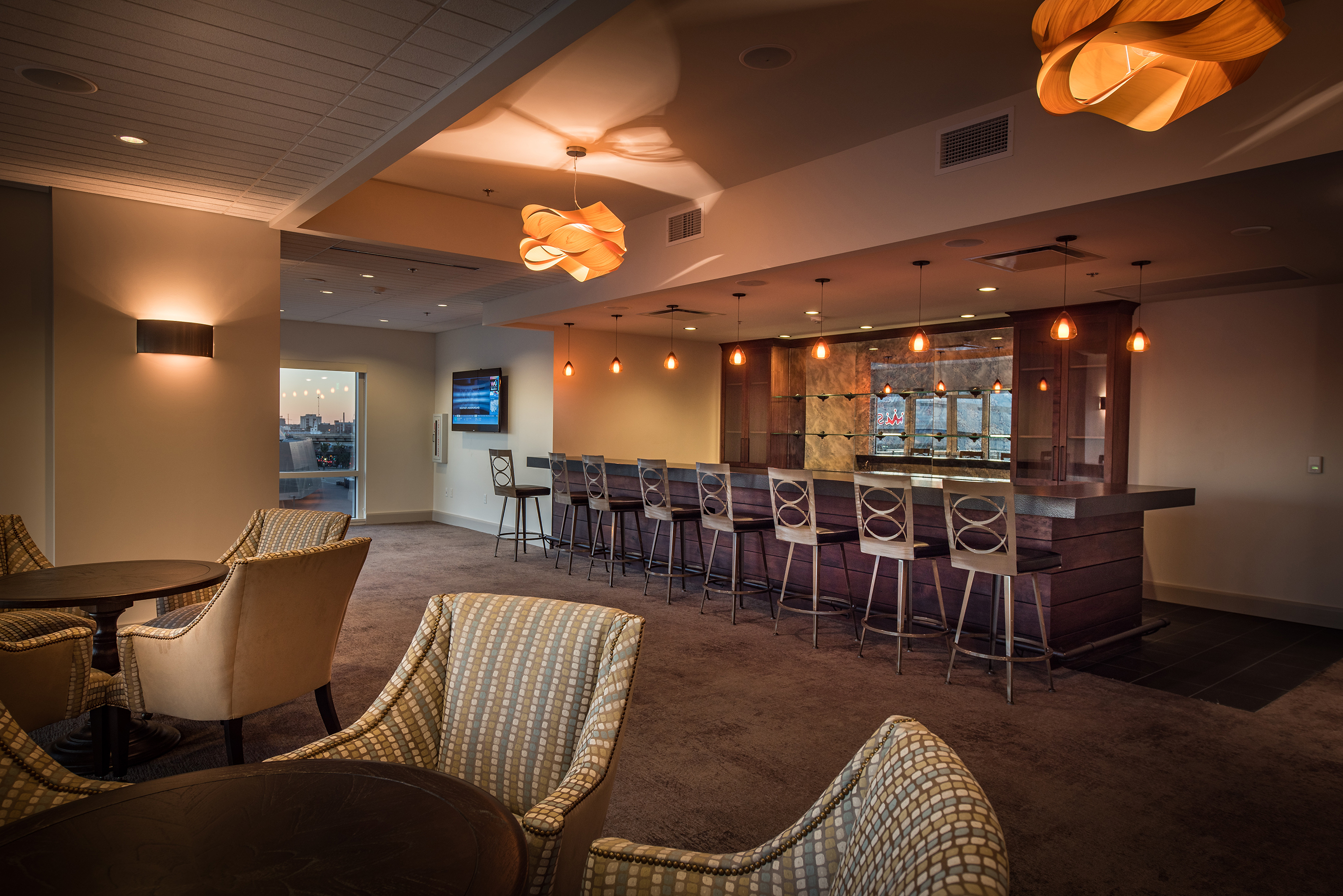The project had many challenges including steel erection 75 feet in the air on an existing building. High coordination with the building managers was needed as the floors below housed an operating medical facility. The design of the project included a rooftop paver terrace overlooking Champion Square with design for a future rooftop pool and Mercedes car displays, custom imported lit glass bar top complete with an outdoor bar and high level interior finishes.