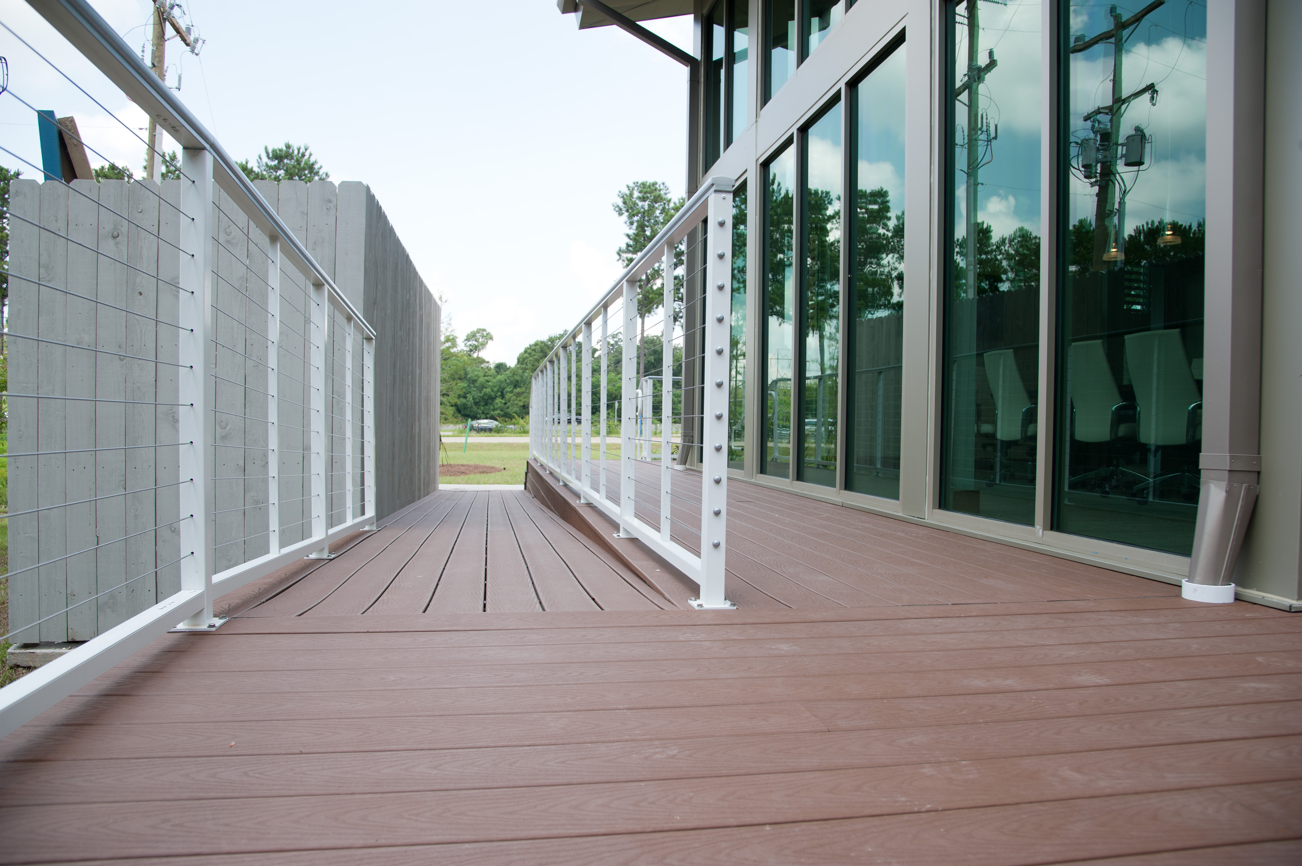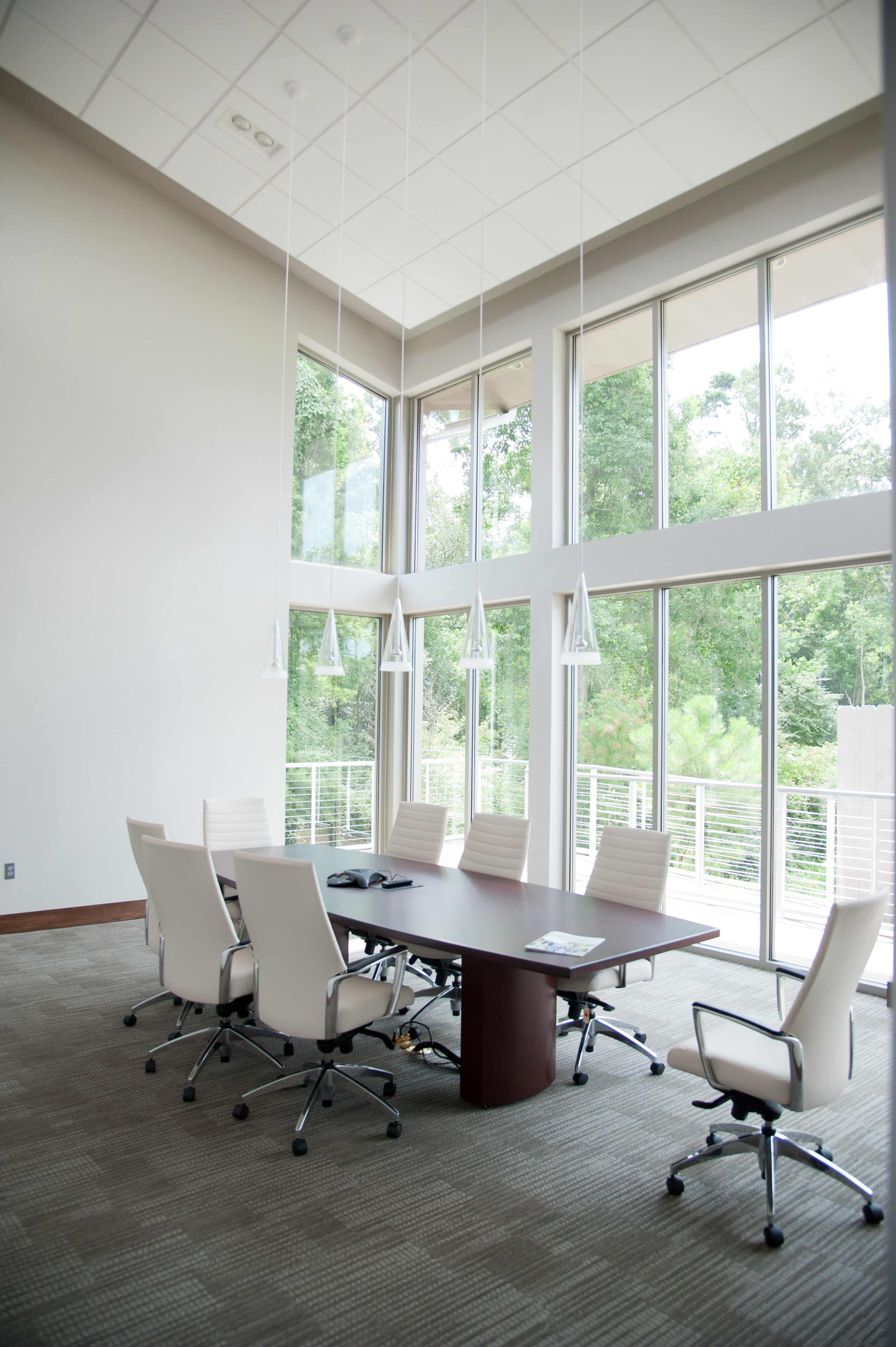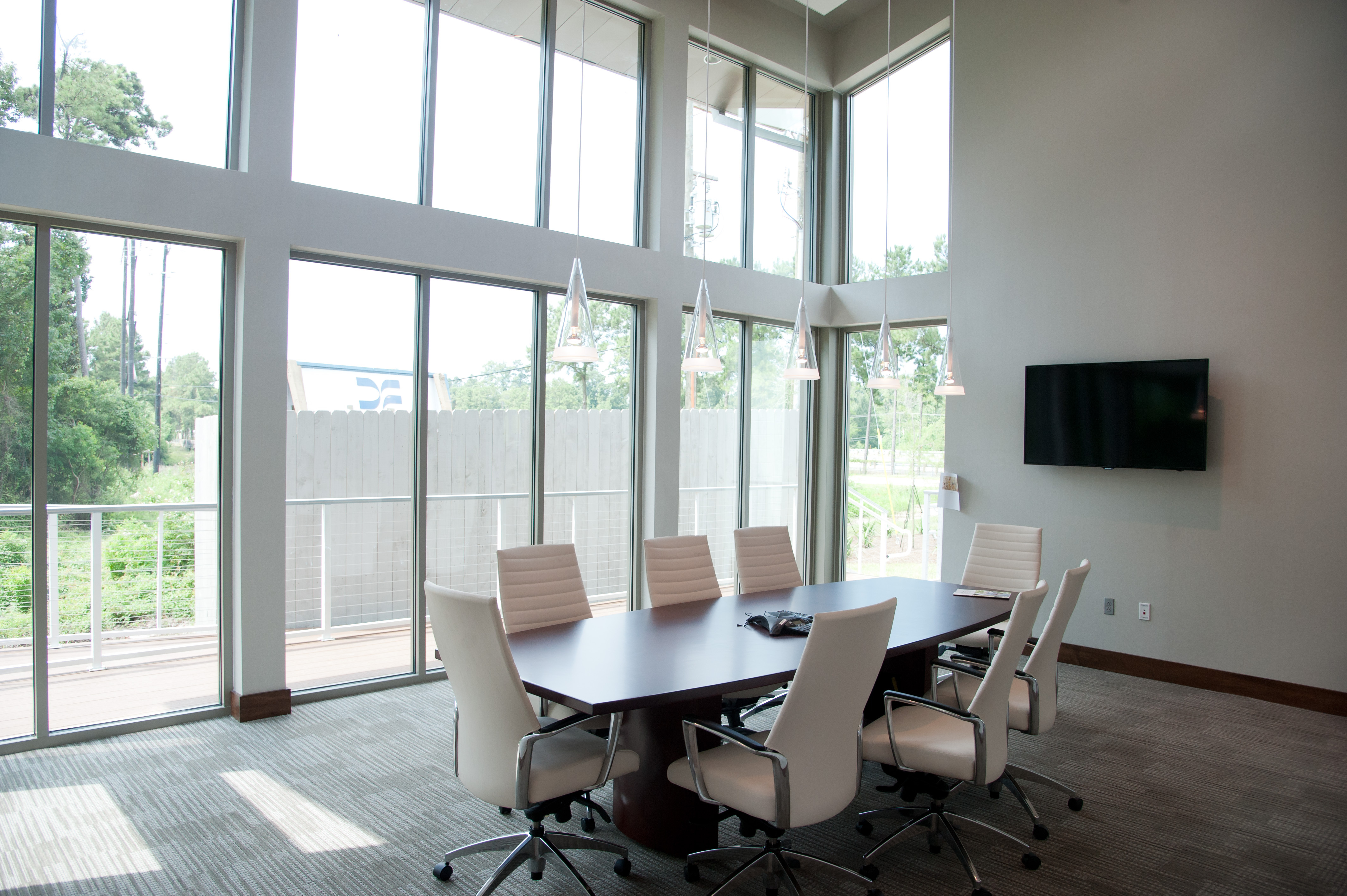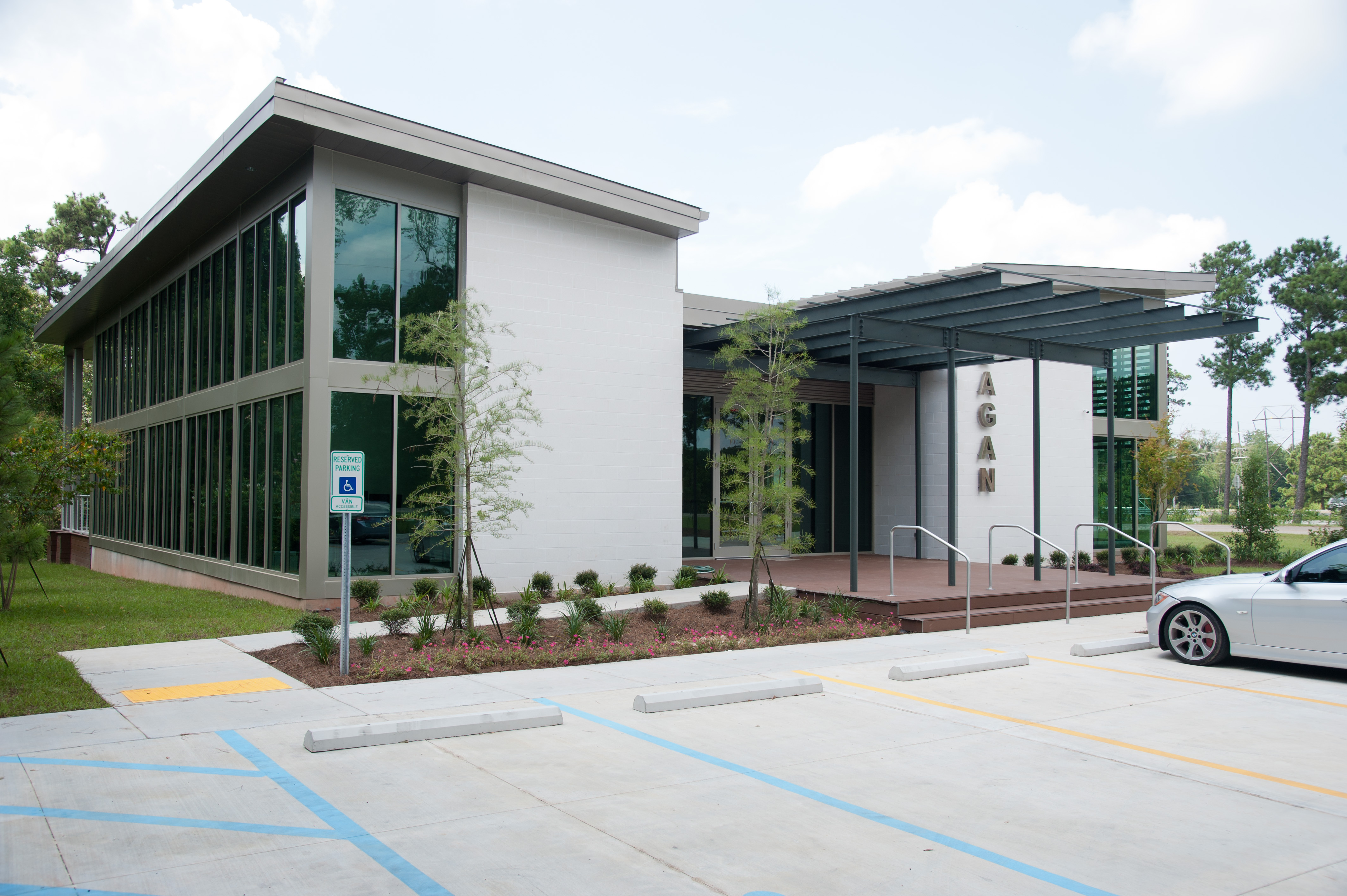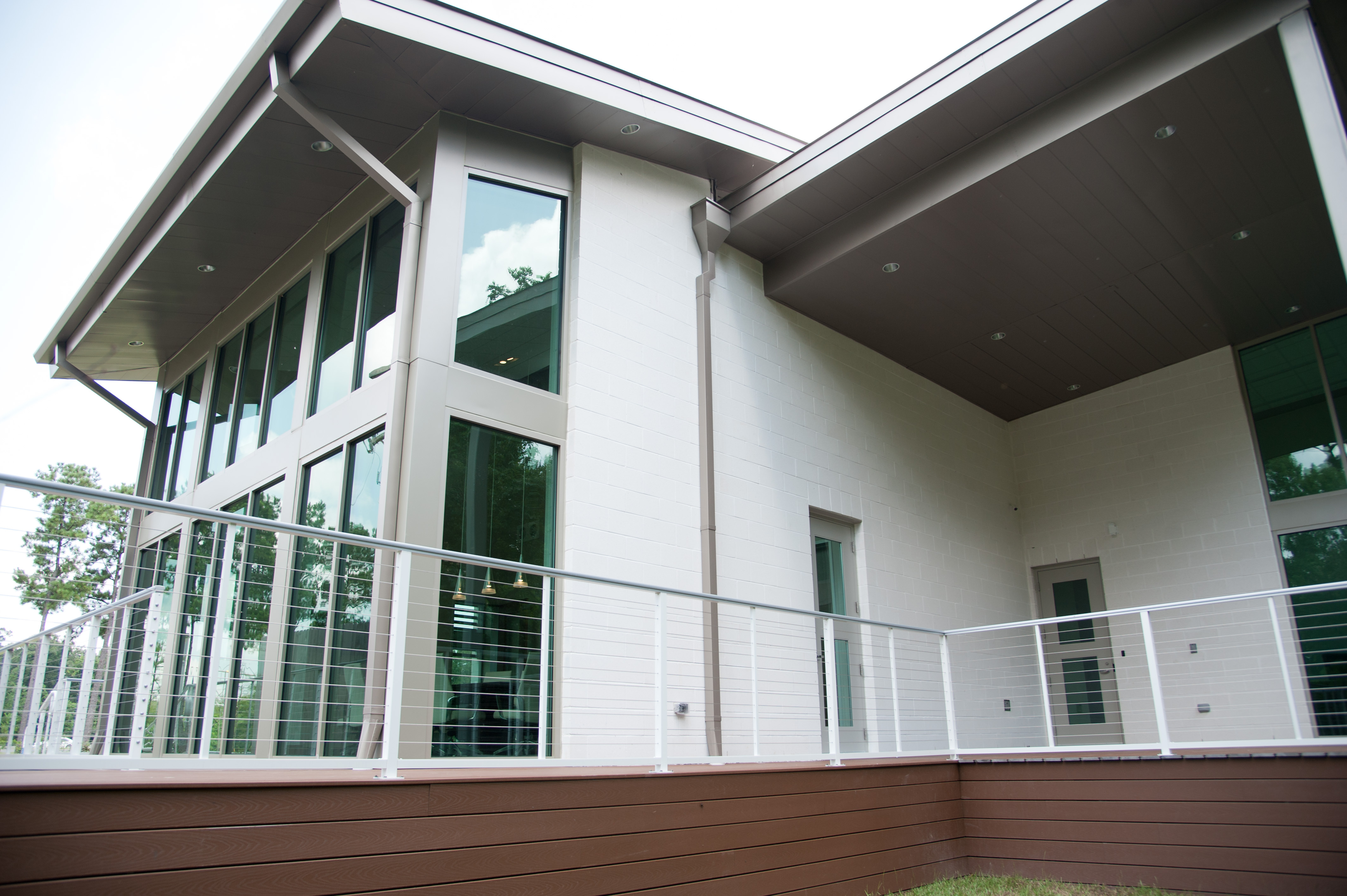 DonahueFavret was hired to construct this ground-up office building. This one-story, day-lit structure features 14-foot ceilings, white concrete masonry units, and teak wood on the facade, as well as a curtain wall solar glazing design. The floor plan includes both an open work area and private offices.