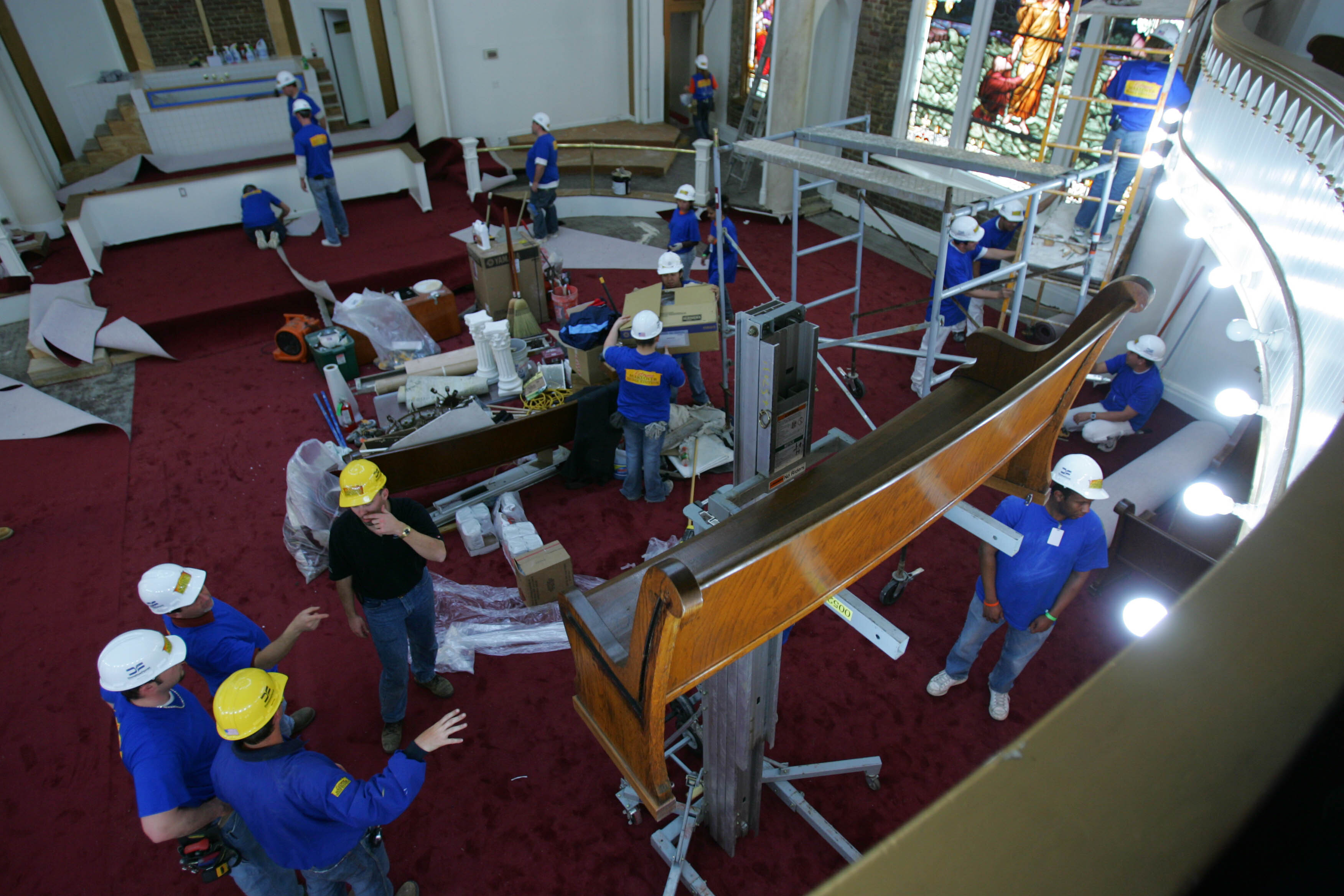 The project required an immense amount of pre- planning and coordination. The renovation of the church consisted of four areas: the exterior of the building, the sanctuary, the gym/classroom/nursery, and the kitchen/ pantry area. Over 2,100 volunteers aided in the project, working at all hours of the day and night to keep the project on schedule.