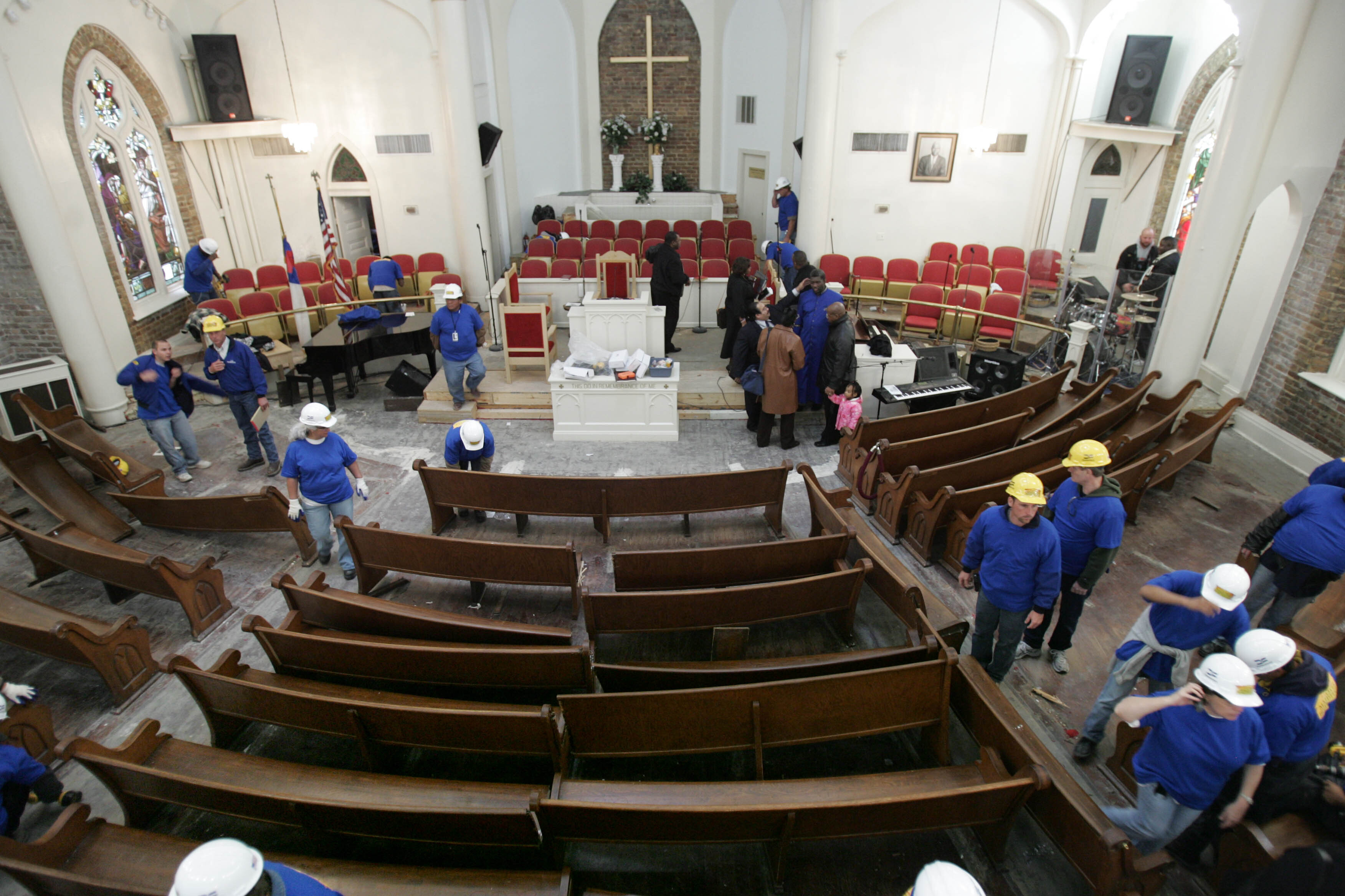 DonahueFavret renovated this historic church in 100 hours with help from Extreme Makeover: Home Edition’s crew. The project required an immense amount of preplanning and coordination. The renovation of the church consisted of four areas: the exterior of the building, the sanctuary, the gym/classroom/nursery, and the kitchen/ pantry area. Over 2,100 volunteers aided in the project, working at all hours of the day and night to keep the project on schedule.