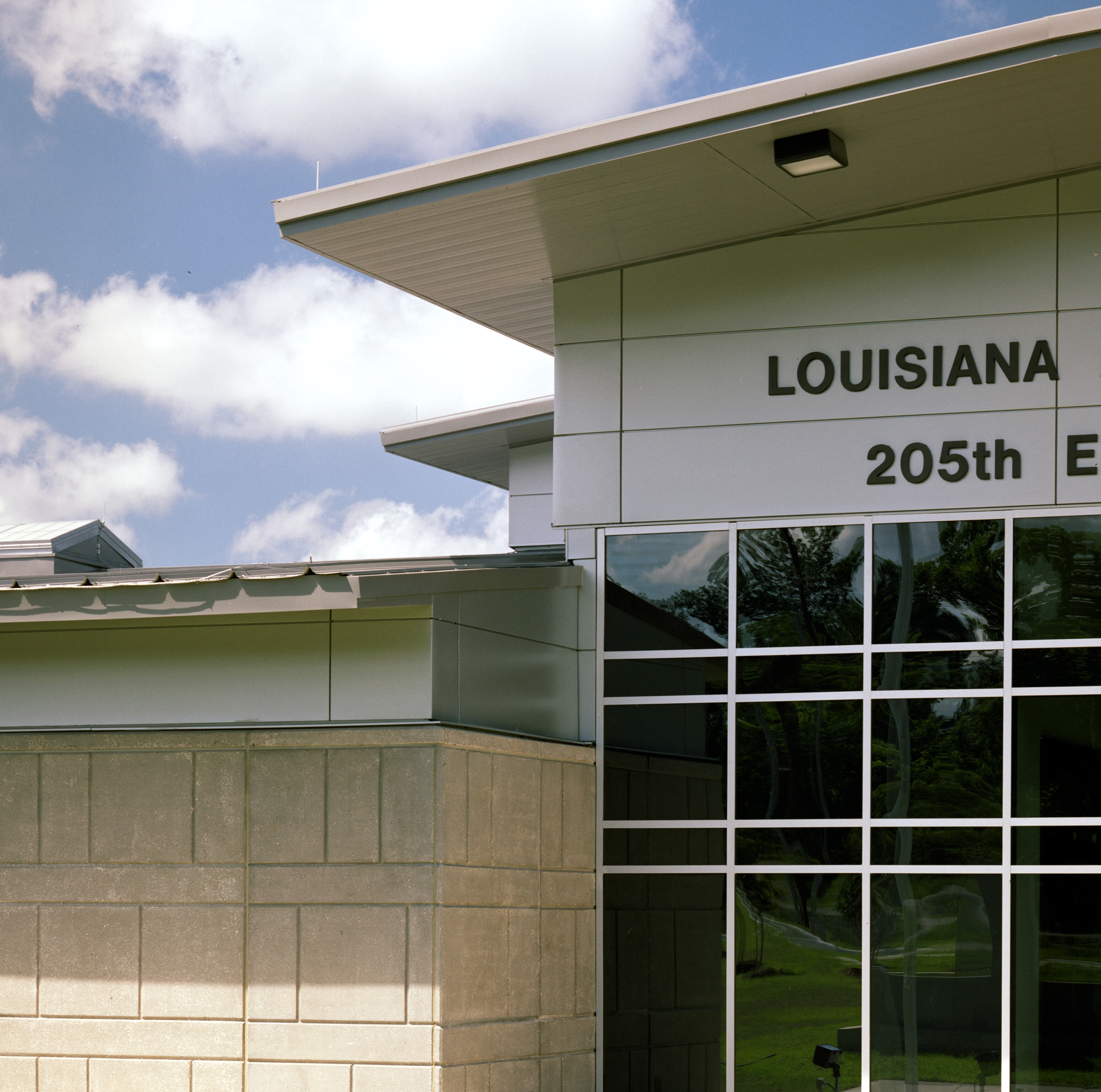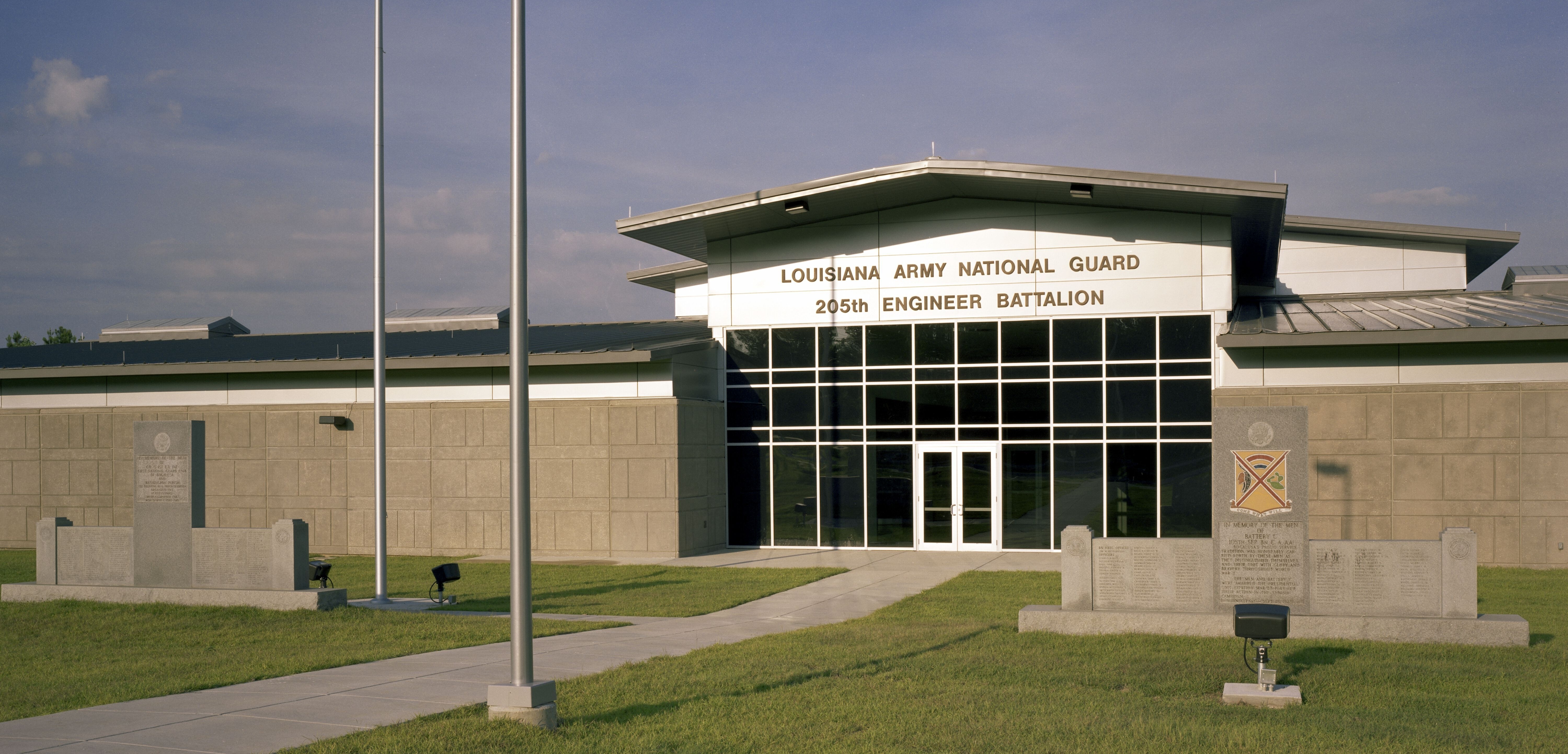 DonahueFavret was the lead on this design-build project for a new state-of-the-art facility, home to 114 soldiers of the 205th Engineer Battalion. The project was originally bid with a set of 35% documents prepared by an architect selected by the Louisiana Army National Guard (LAANG). The project consisted of a main building, a maintenance training bay, an unheated storage building, a flammable waste building, and a wash rack. The design had to comply with Anti-Terrorism Force Protection regulations. The project achieved a Gold SPiRiT (Sustainable Project Rating Tool) certification, which is a similar system to LEED.