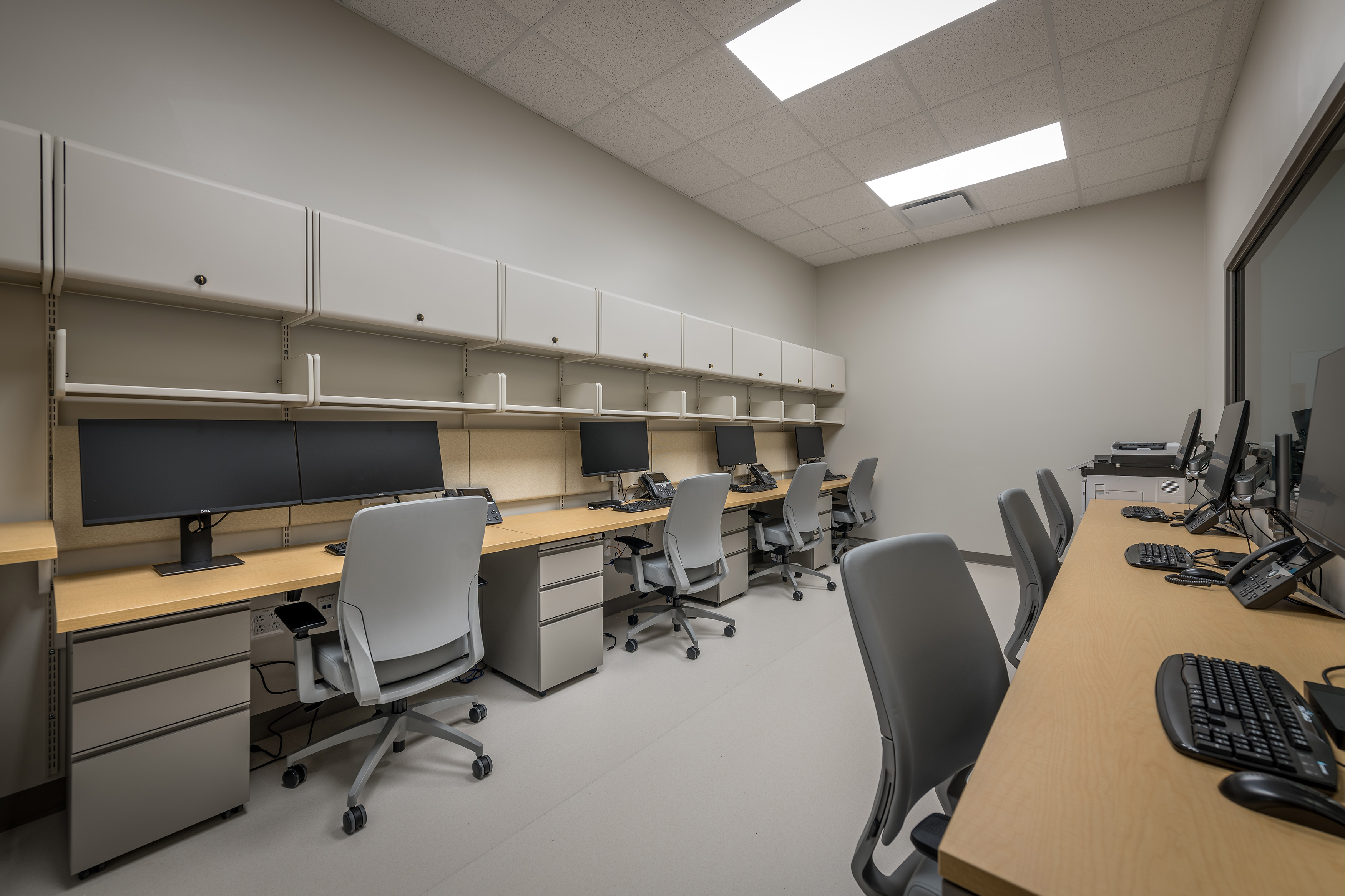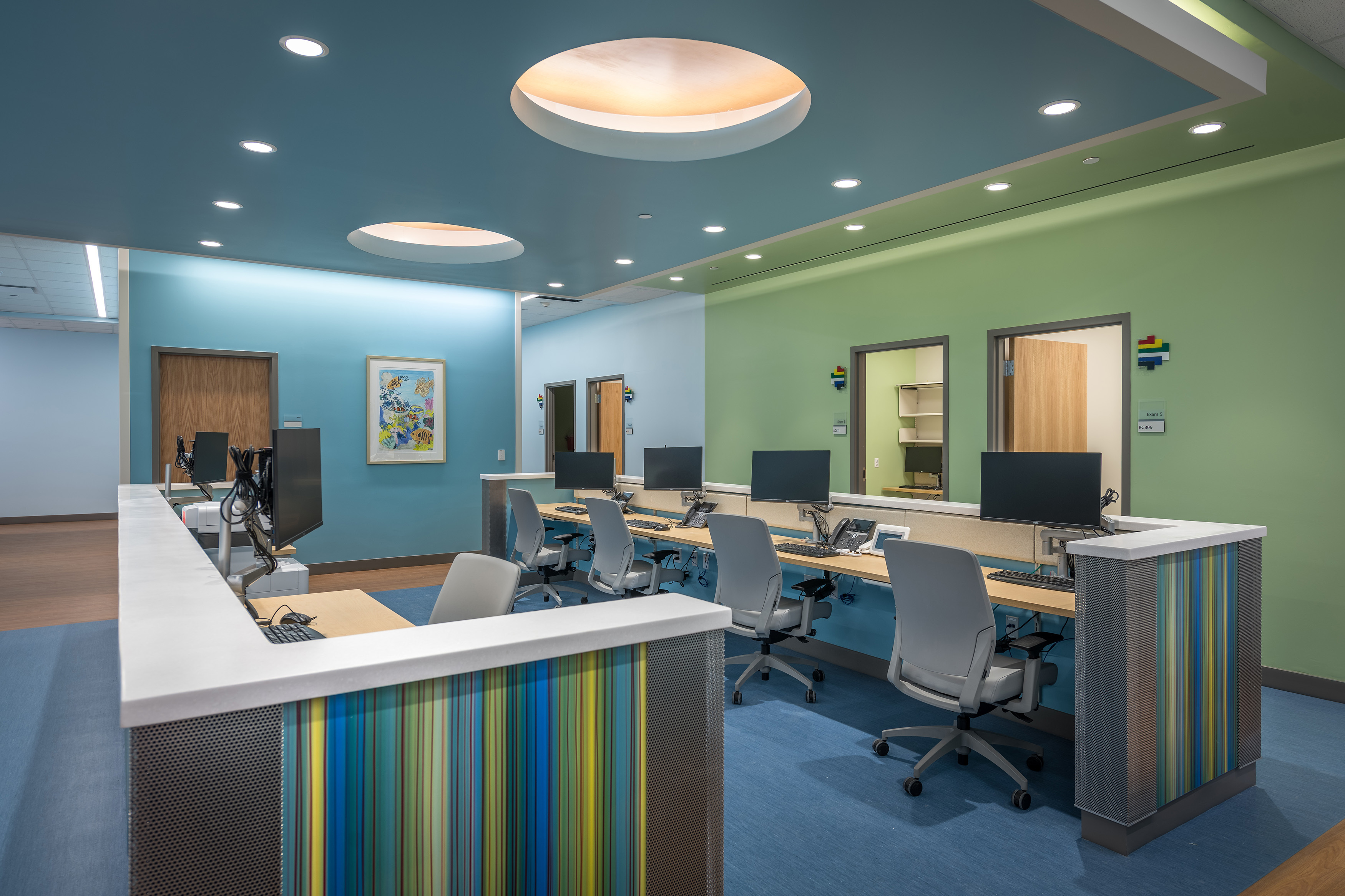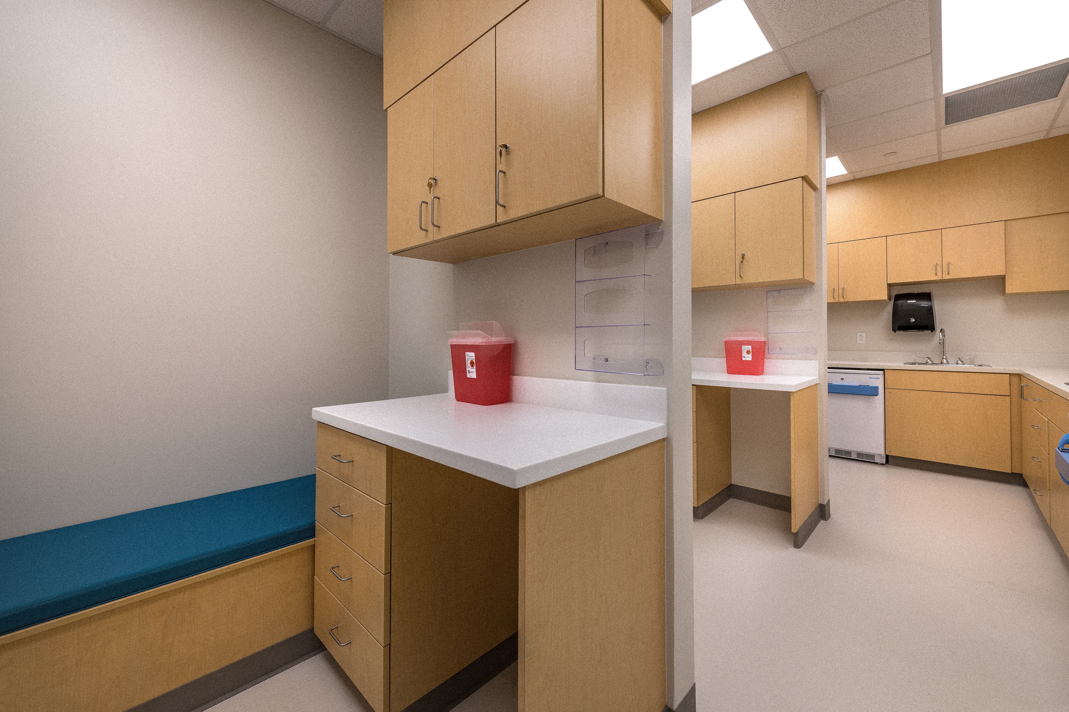 DonahueFavret Contractors renovated a 17,500 SF existing retail space into this Children’s Clinic for Ochsner Health. The building houses two separate clinics, pediatrics and pediatric rehabilitation. Two main corridors separate the two clinics, each with exam rooms, nurses’ stations, and a rehabilitative gym to optimize physical, cognitive, and social function of patients. The project proposed some challenges with replacing all the rooftop units, updating the HVAC system, and working around the 25-foot metal stud walls to install drywall. The floors consist of sheet vinyl throughout the building and wall covering in most of the exam rooms with markerboard finish.