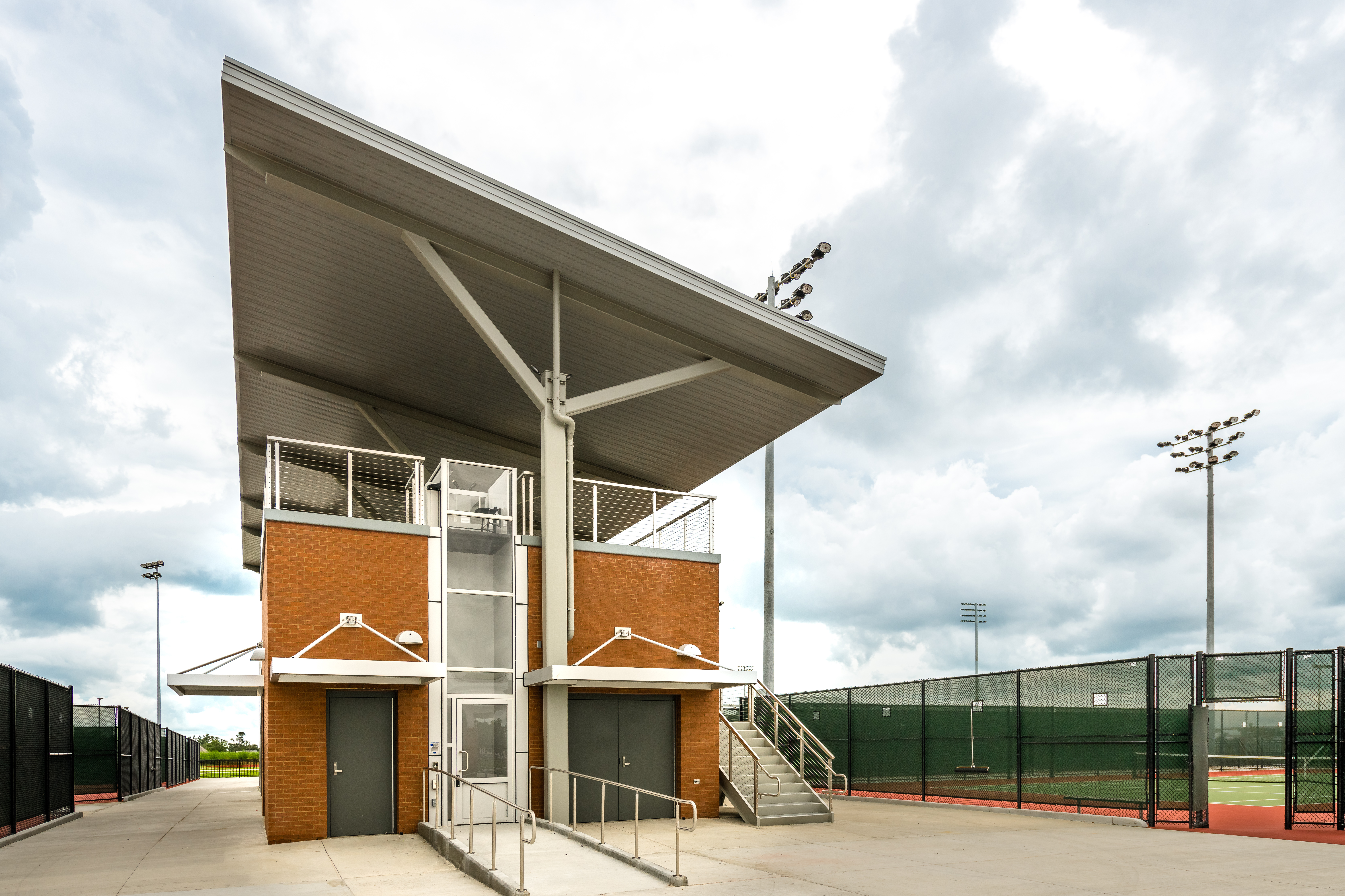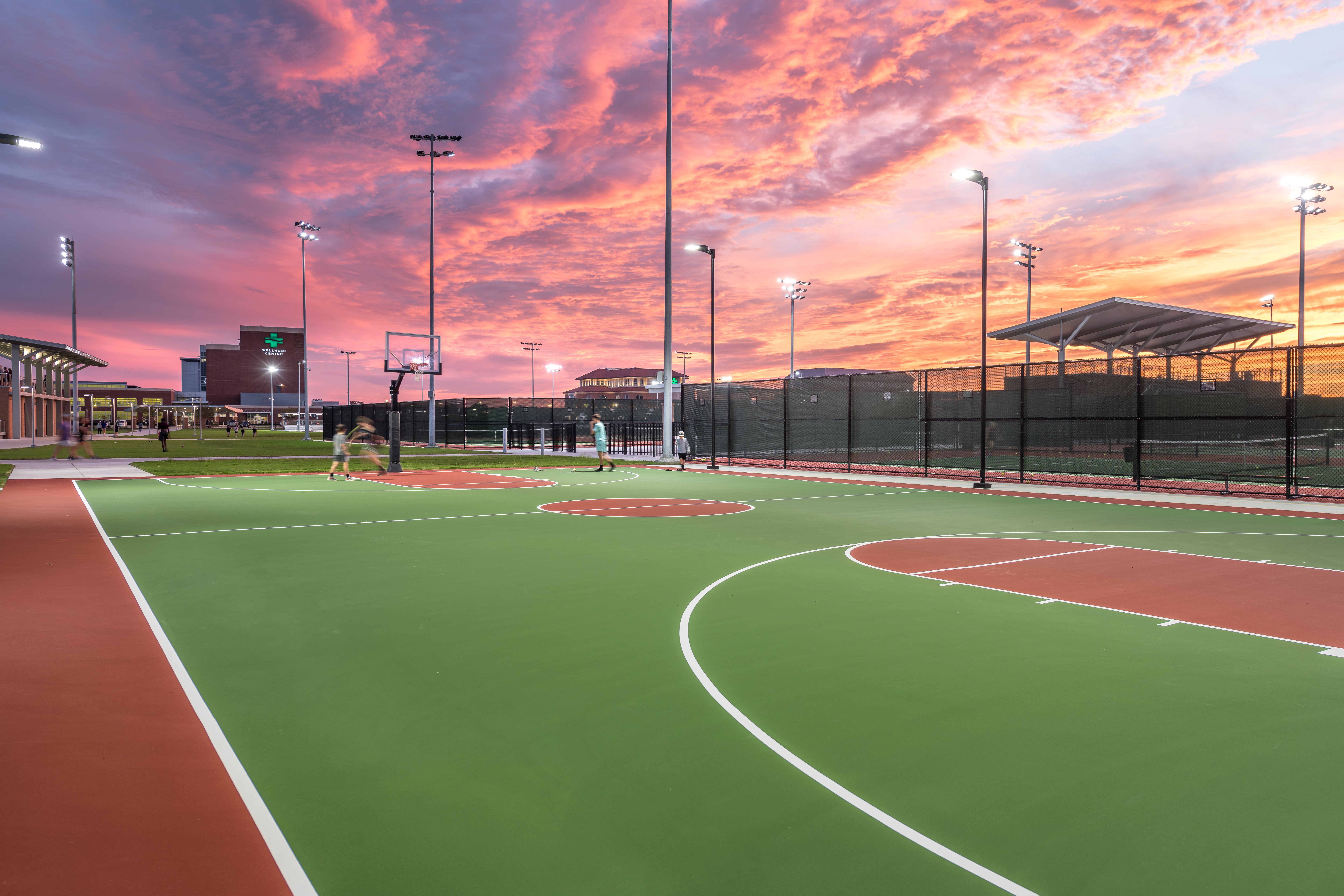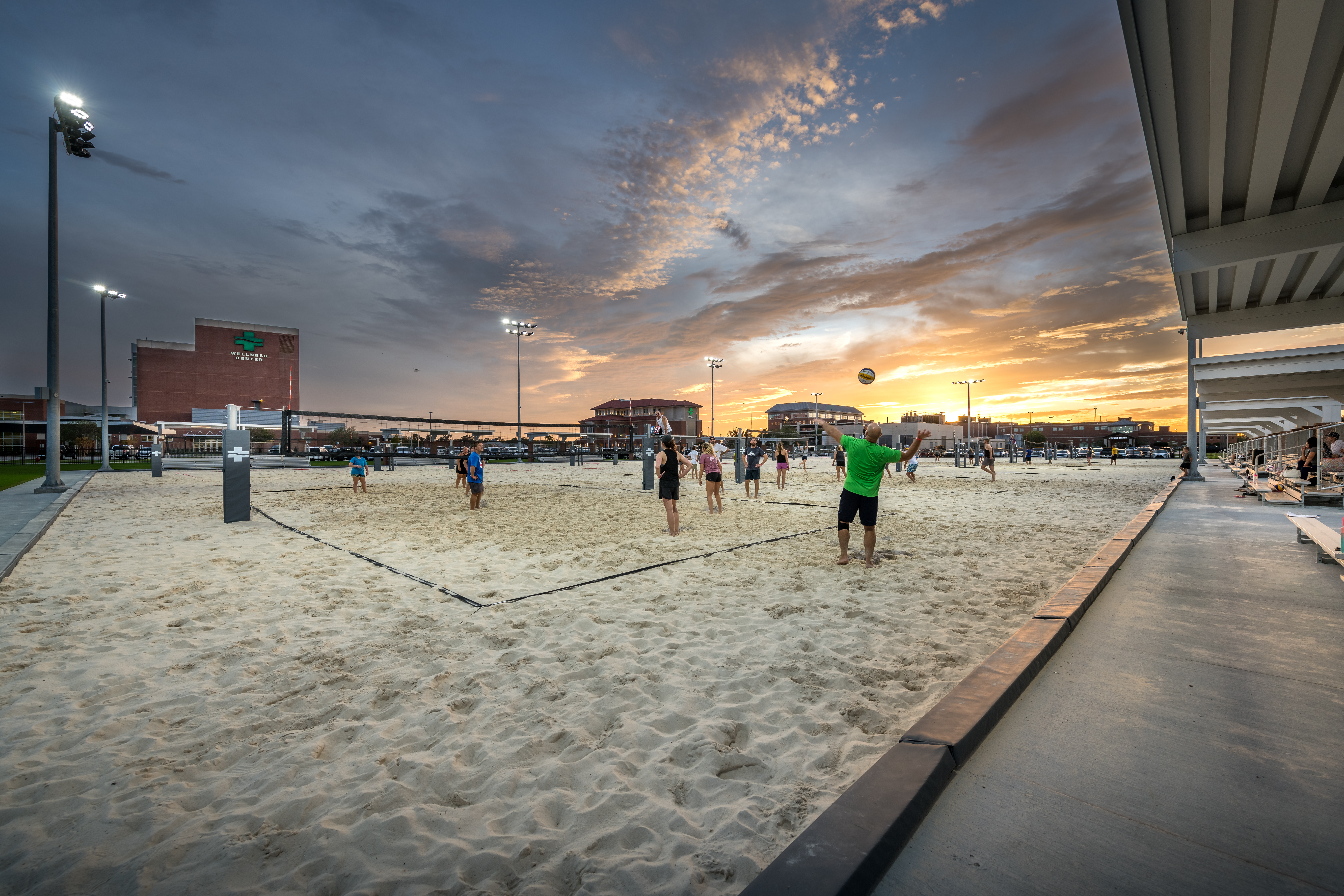 The site includes 12 sand volleyball courts and associated spectator seating, making them the largest NCAA courts in the region. It features an 8-lane track along the perimeter of the field, and 12 tennis courts – again, all of which are built to NCAA standards. Located within the tennis grandstand is a pro shop. Lastly, the site features an outdoor basketball court built and striped to high school standards, a half-acre central retention pond, and a three-quarter-acre detention pond built to comply with stormwater regulations located on the southern end of the football/soccer field.