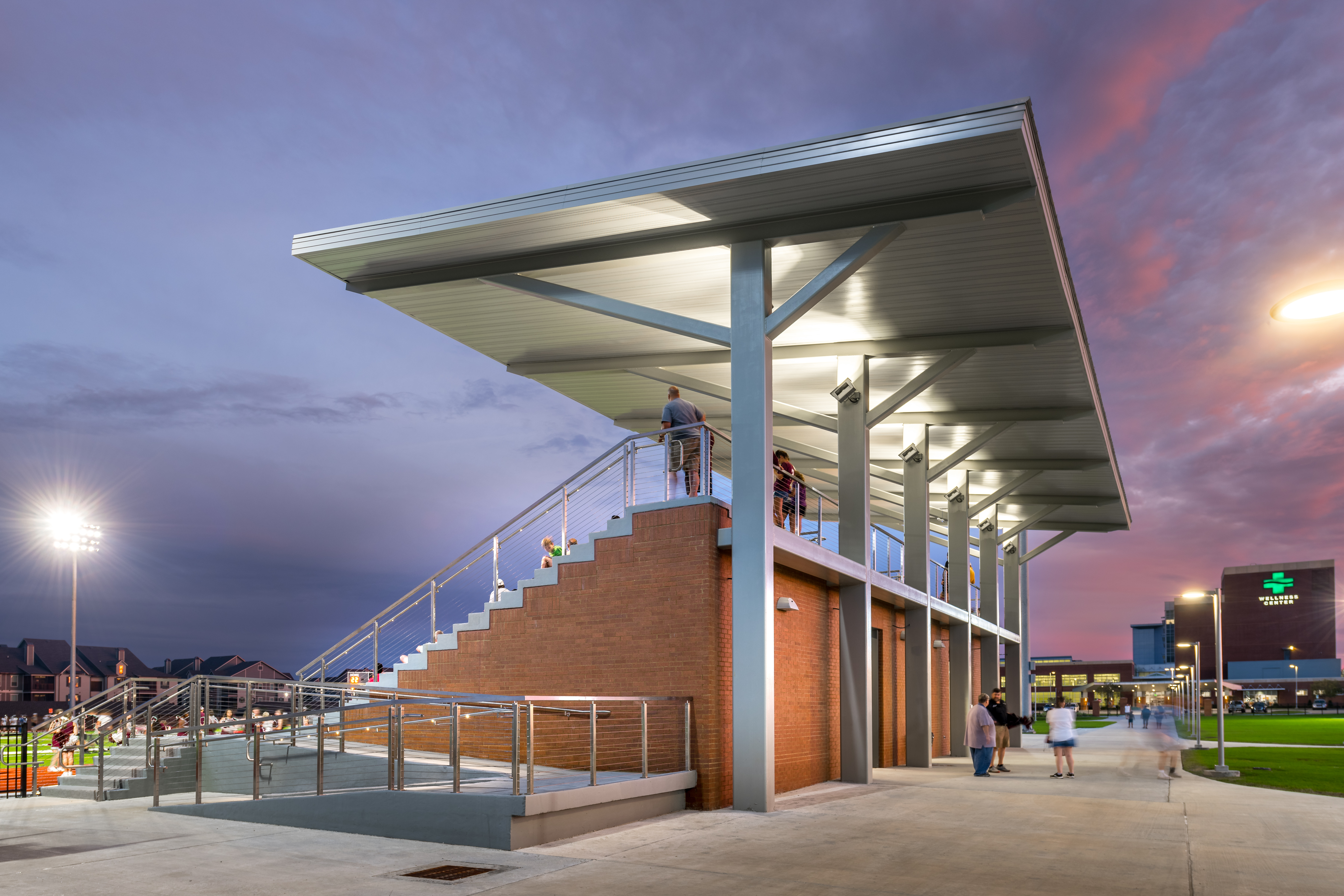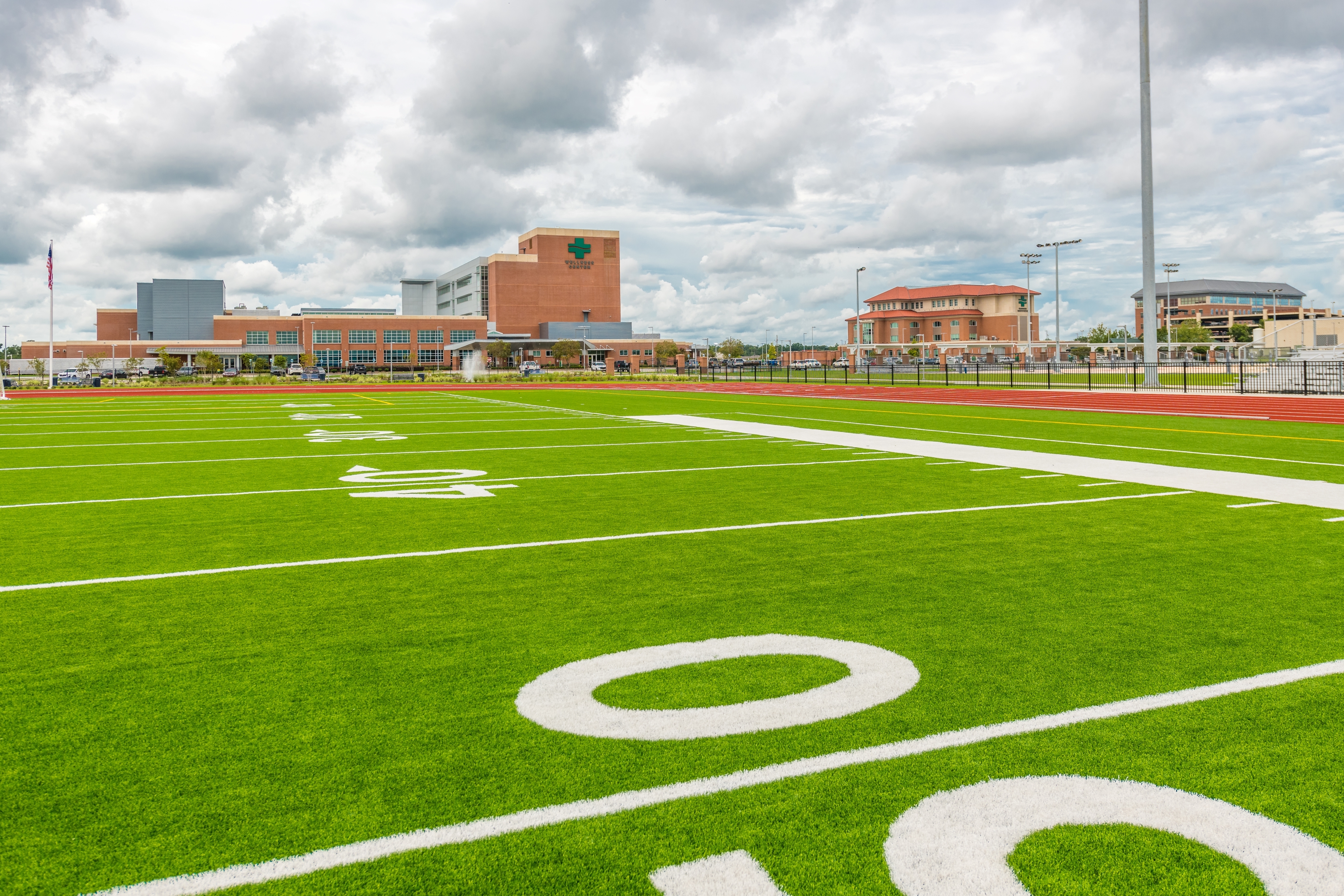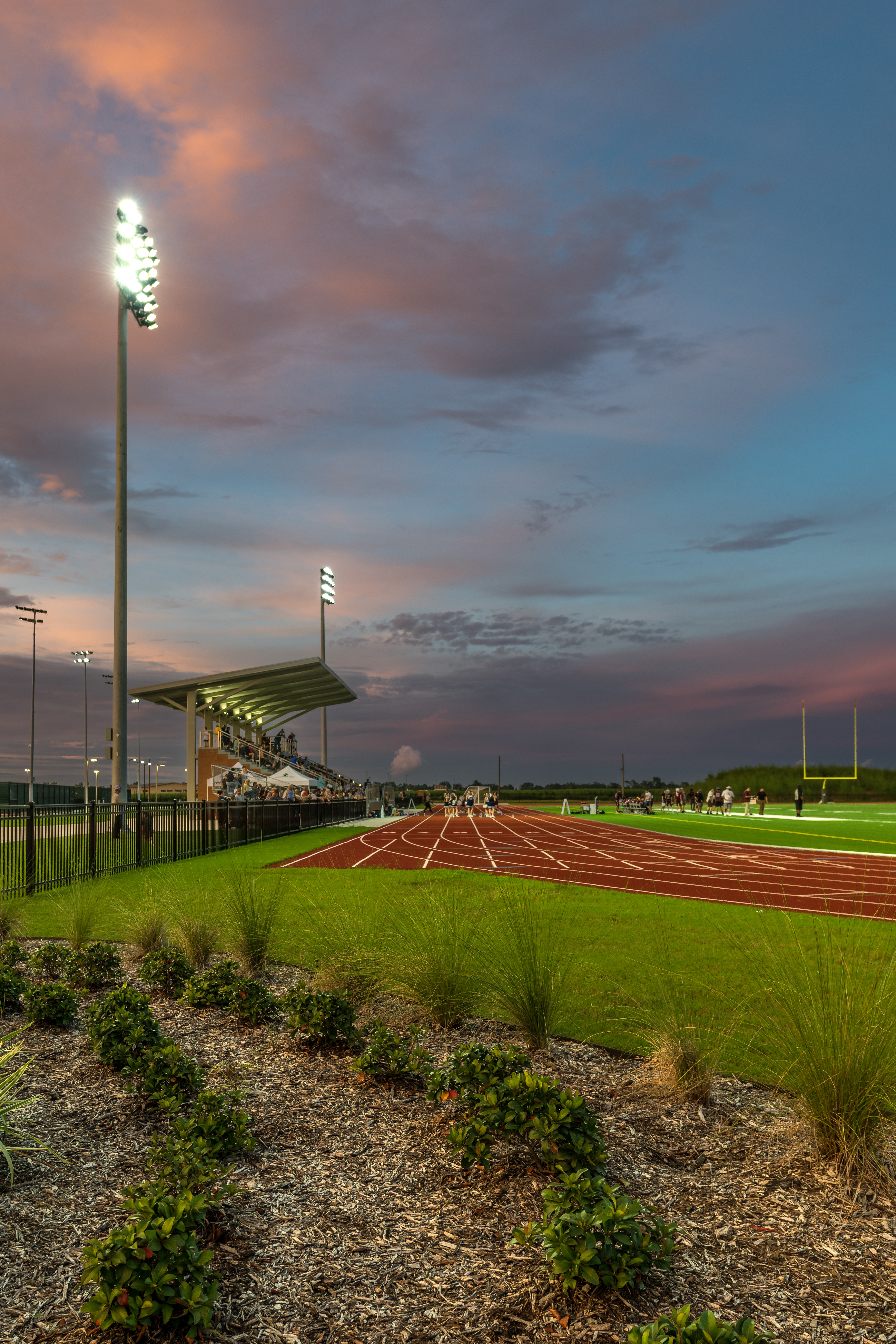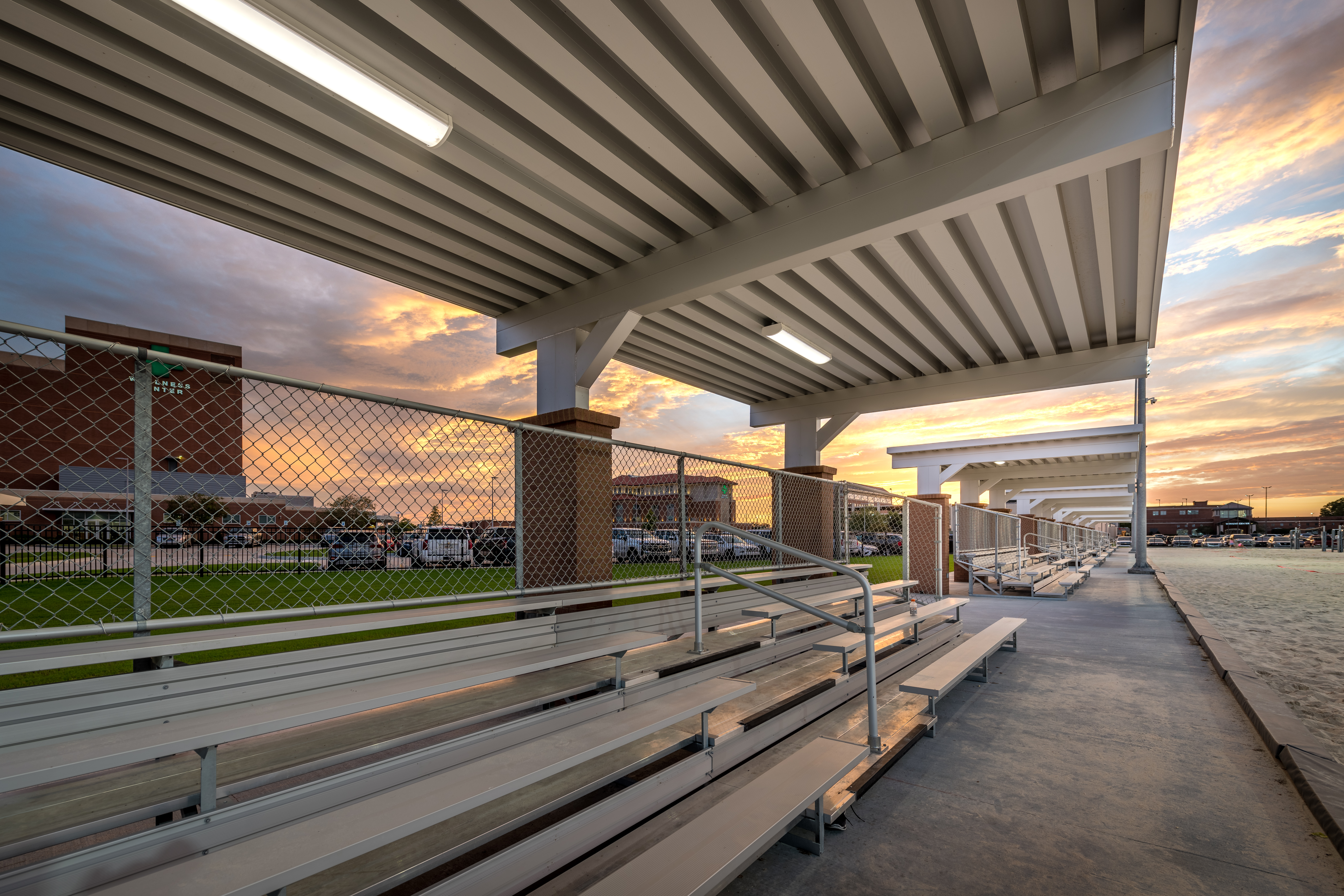 The site includes 12 sand volleyball courts and associated spectator seating, making them the largest NCAA courts in the region. It features an 8-lane track along the perimeter of the field, and 12 tennis courts – again, all of which are built to NCAA standards. Located within the tennis grandstand is a pro shop. Lastly, the site features an outdoor basketball court built and striped to high school standards, a half-acre central retention pond, and a three-quarter-acre detention pond built to comply with stormwater regulations located on the southern end of the football/soccer field.