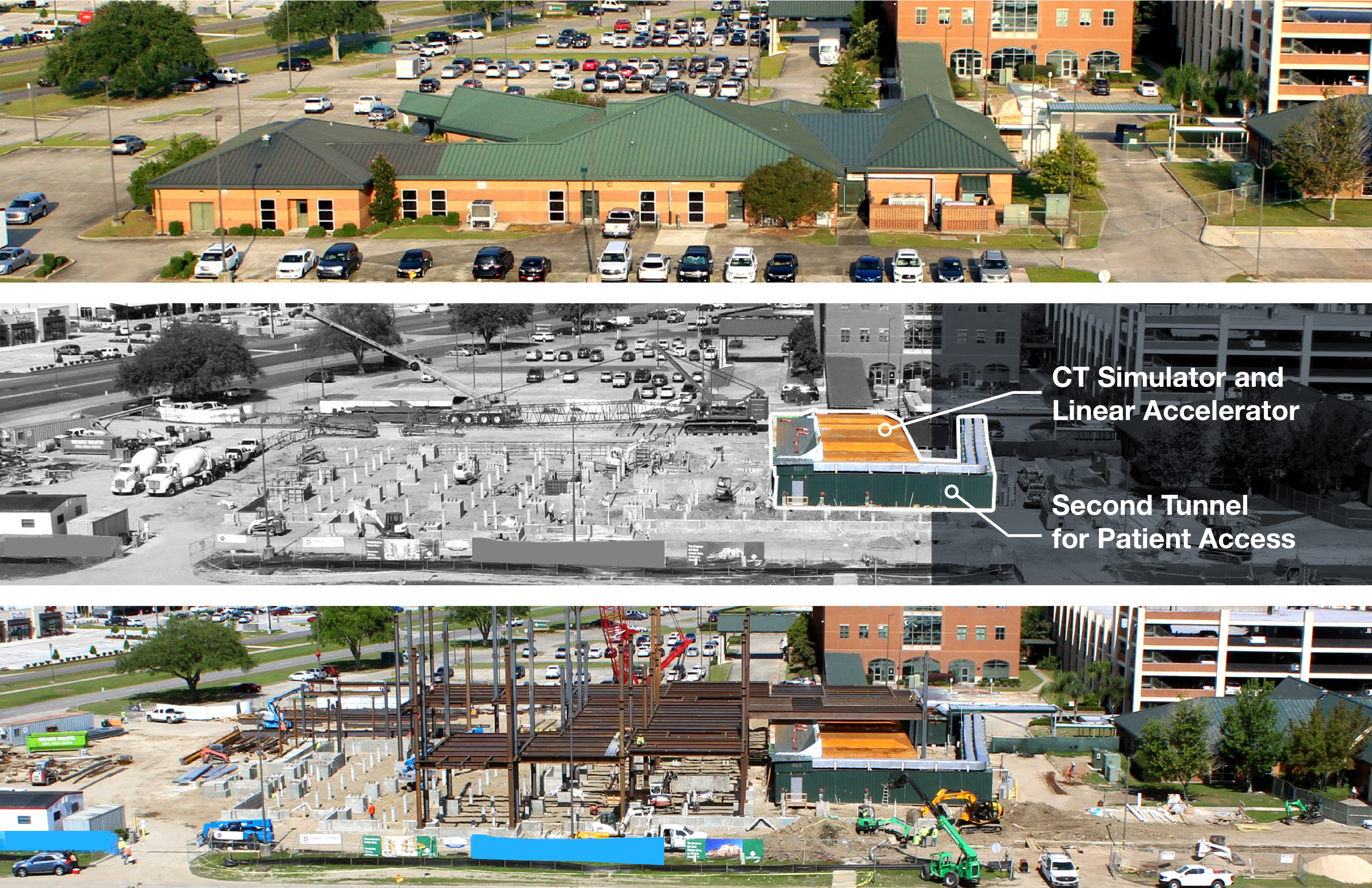 Approximately 3 weeks into the start of construction, our team set about the unusual task of constructing the new facility on top of an existing operational linear accelerator(LINAC) and CT Simulator – radiation equipment housed in large vaults critical to cancer treatment. A client-driven decision was made at this time to relocate the CT Simulator from the existing Cancer Center to a spare empty LINAC vault, therefore changing the phasing schedule previously established for the project.